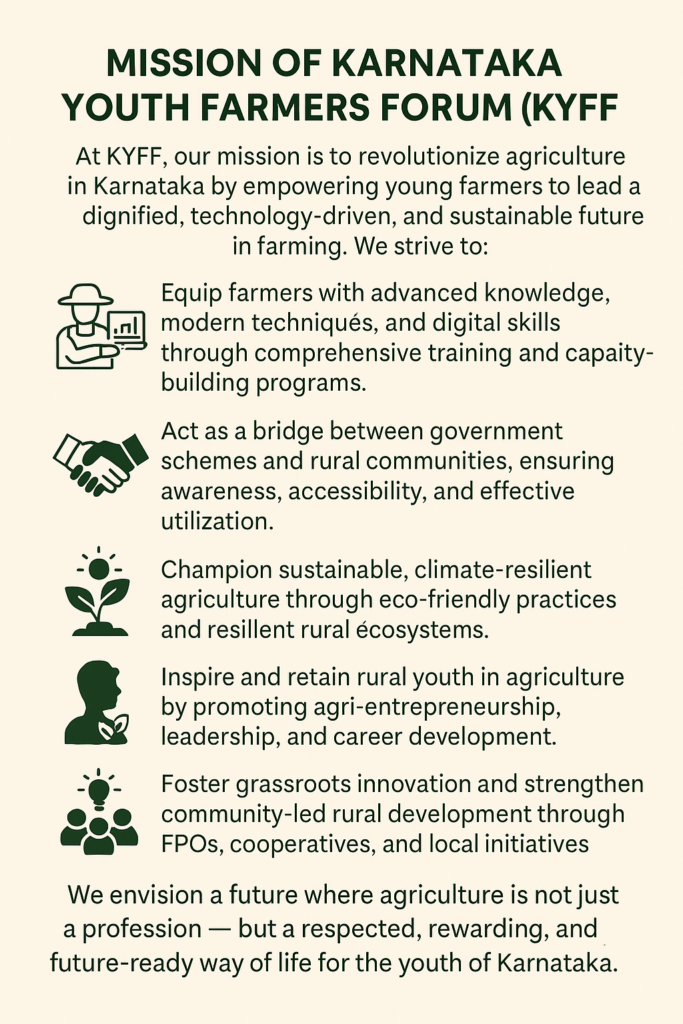 Karnataka Youth Farmers Forum (KYFF) is a grassroots non-profit organization committed to empowering the next generation of farmers across Karnataka. Founded with a vision to transform agriculture into a dignified, profitable, and future-ready profession, KYFF works tirelessly at the intersection of education, innovation, sustainability, and policy awareness.